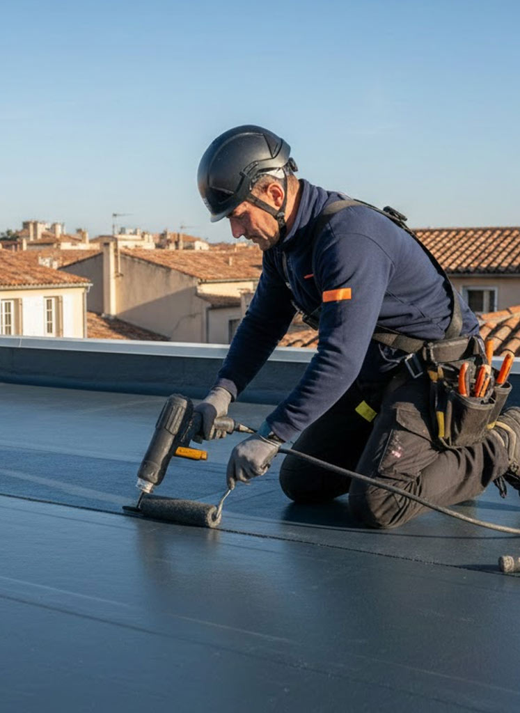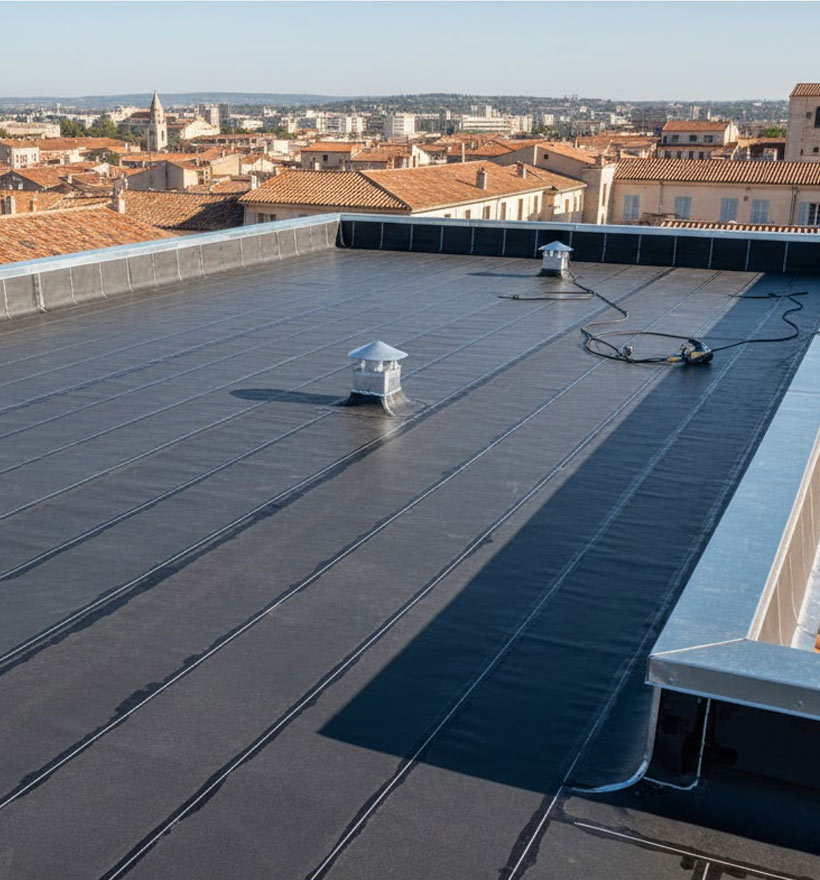Nous intervenons sur toits en pente (avec couverture en tuiles selon les configurations), mais aussi sur toits plats, toiture plate et toits-terrasses. Chaque projet est analysé pour sécuriser les points sensibles, les joints, les relevés et la continuité de la couche d’étanchéité.